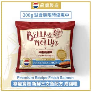 人氣好評!Bella & Molly 貝莉皇家貓糧,精選AAFCO抗衰老單一蛋白三文魚配方,專為成貓設計,無穀物更健康。200g限量體驗裝,助愛貓消化吸收好,毛髮亮澤。限時免費罐頭小食即送,立即搶購! Bella & Molly's 荷蘭貝莉皇家貓糧 AAFCO 抗衰老無穀物系列 單一蛋白 三文魚配方 200g (限時體驗)