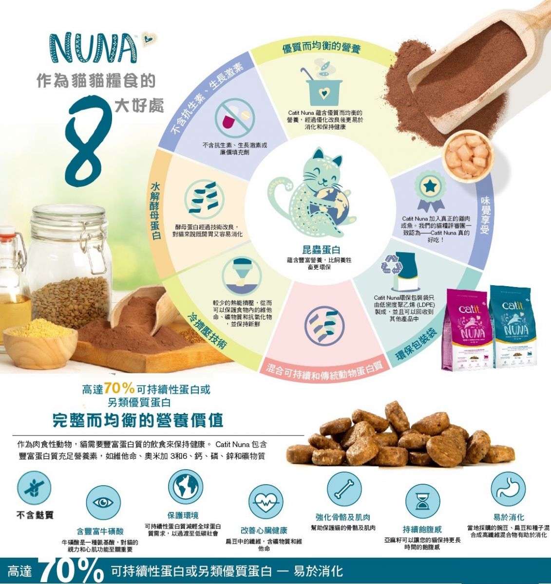 Catit Nuna 作為一個提倡環保且優質的貓糧品牌,其獨特的品牌定位在於將永續發展與寵物健康完美結合。品牌核心價值體現在其創新性的營養來源——昆蟲動物性蛋白,這不僅為貓咪提供與傳統肉類同等豐富且美味的營養,更有效降低碳足跡,展現對地球環境的深度關懷。Catit Nuna 致力於為現代貓咪家庭提供一個兼具營養、美味與環保責任的優質選擇,引領寵物食品行業邁向更永續的未來。