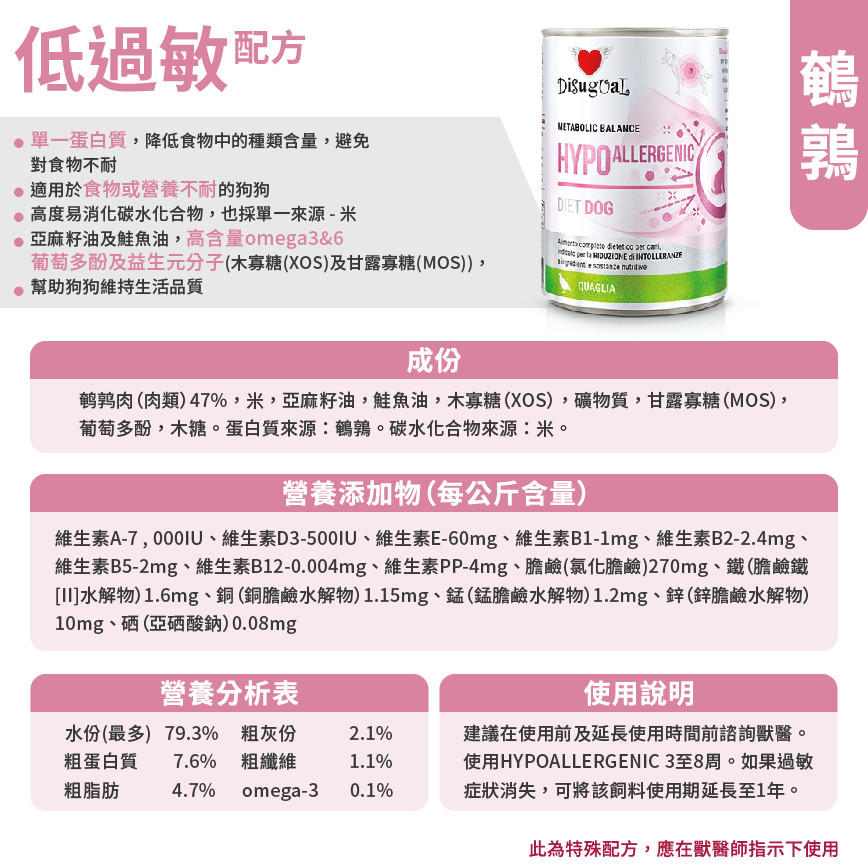 Disugual 意極鮮 處方糧 狗罐頭 低敏配方 鵪鶉 400g (DSDT001) | 意大利製造