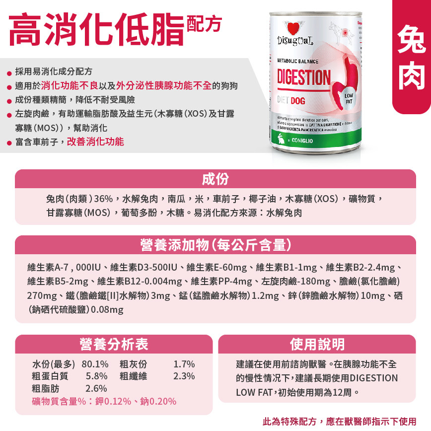 優質營養!Disugual 意極鮮 兔肉高消化低脂狗罐頭,400g 意大利製造,專業配方專為高消化低脂需求設計。這款 Disugual 處方糧 狗罐頭,特別適合有腸胃敏感或需要低脂飲食的狗狗。採用優質兔肉,提供均衡營養,幫助狗狗維持消化健康。立即選購,享新會員三連送優惠! Disugual 意極鮮 處方糧 狗罐頭 高消化低脂配方 兔肉 400g (DSDT012) | 意大利製造
