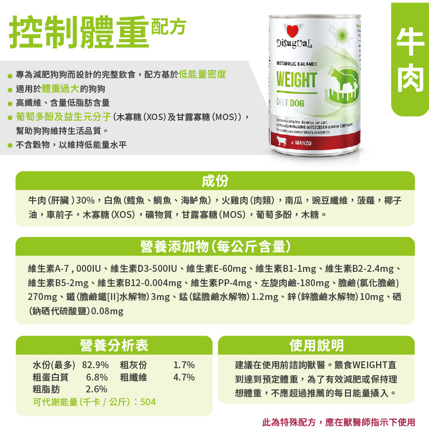 Disugual 意極鮮 處方糧 狗罐頭 控制體重配方 牛肉 400g (DSDT070) | 意大利製造