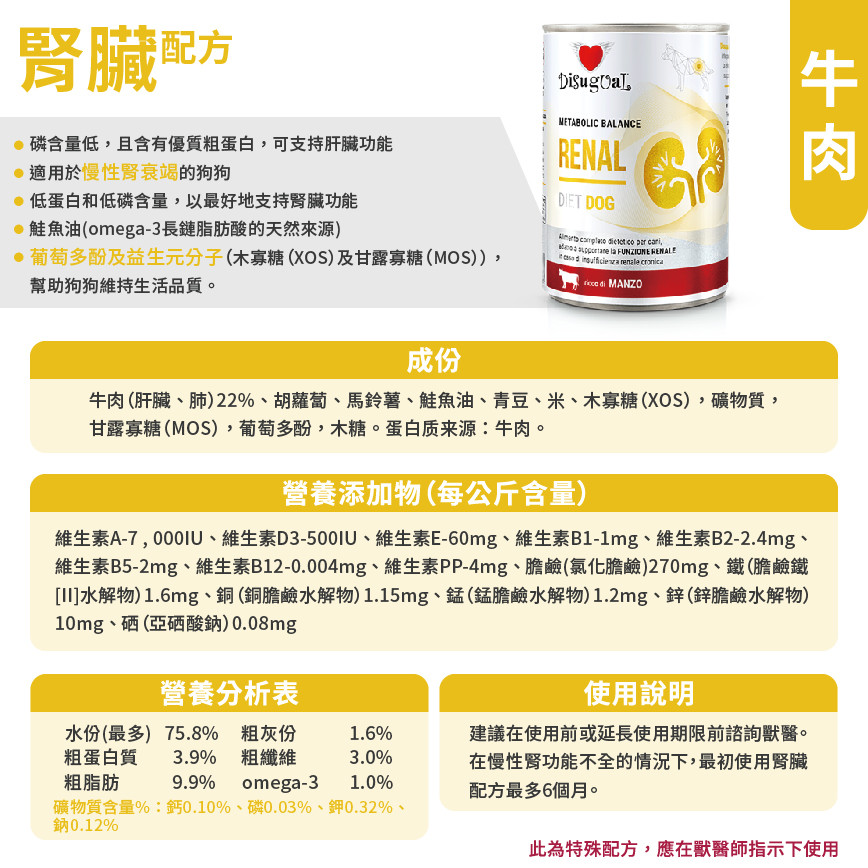 專業配方!Disugual 意極鮮狗罐頭,專為腎臟問題設計的牛肉處方糧,每罐400g,意大利製造,助愛犬維持健康。立即選購,新會員三連送! Disugual 意極鮮 處方糧 狗罐頭 腎臟配方 牛肉 400g (DSDT051) | 意大利製造