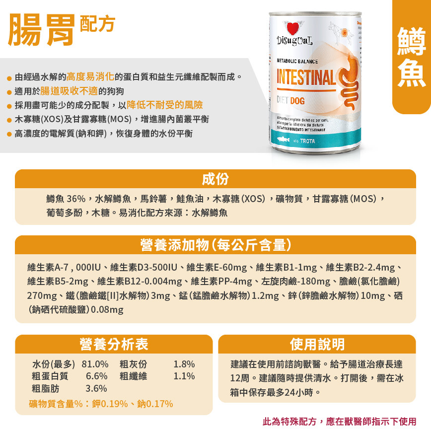 Disugual 意極鮮 處方糧 狗罐頭 腸胃配方 鱒魚 400g (DSDT032) | 意大利製造