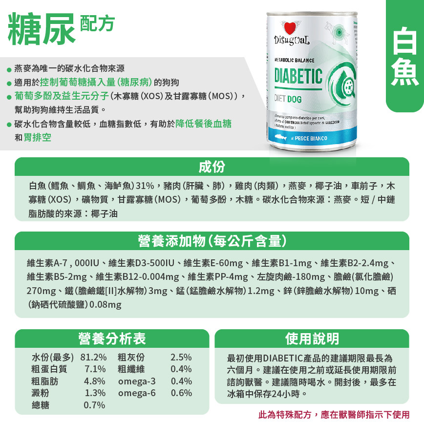Disugual 意極鮮 處方糧 狗罐頭 糖尿病配方 白魚 400g (DSDT082) | 意大利製造