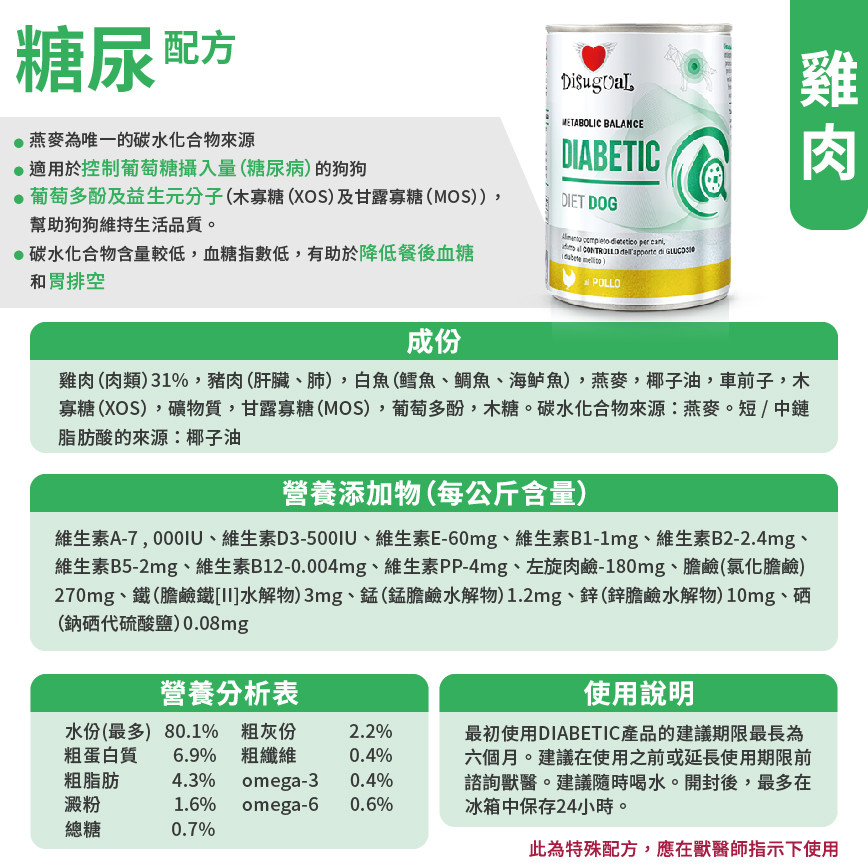 優質營養!Disugual 處方糧狗罐頭,專為糖尿病犬設計的雞肉配方,400g大容量,意大利製造。助愛犬穩定血糖,健康生活。香港至抵價格保證,立即選購! Disugual 意極鮮 處方糧 狗罐頭 糖尿病配方 雞肉 400g (DSDT081) | 意大利製造
