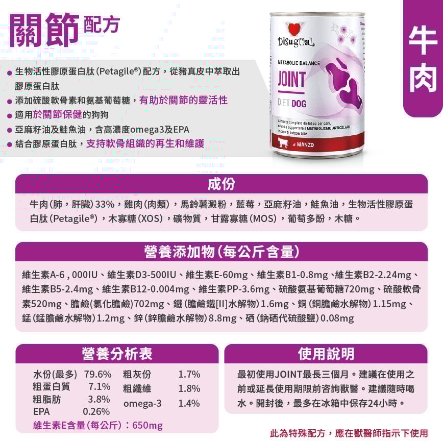 Disugual 意極鮮 處方糧 狗罐頭 關節保健配方 牛肉 400g (DSDT040) | 意大利製造