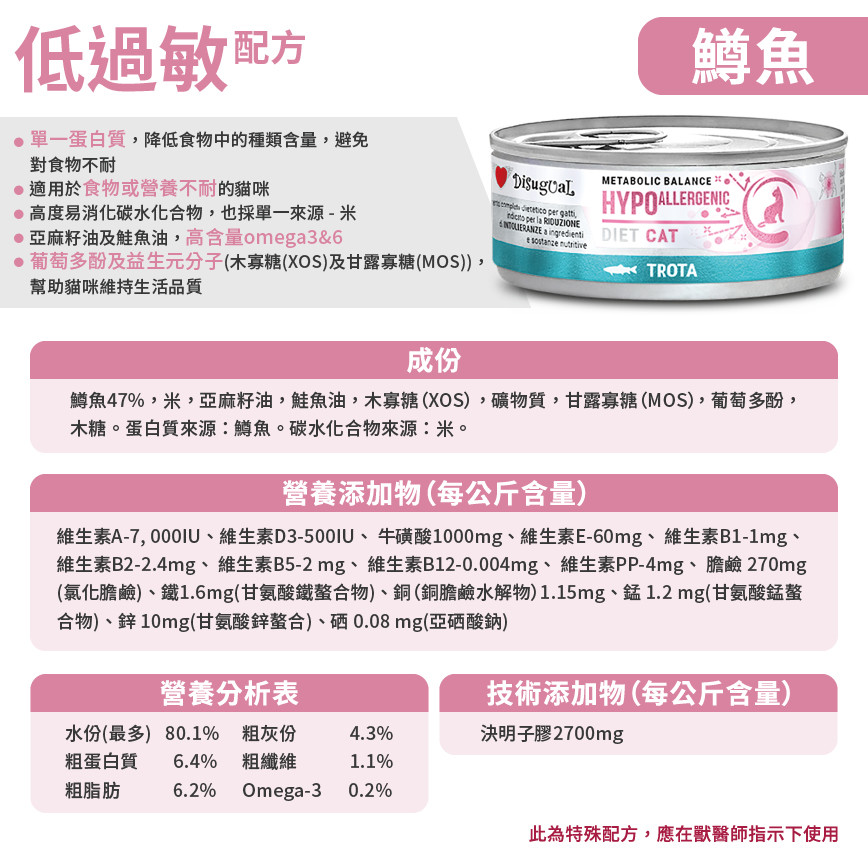 首頁 > 貓貓 > 貓罐頭 貓濕糧 > Disugual 處方糧 > Disugual 意極鮮 處方糧 貓罐頭 低敏配方 鱒魚 85g (DSDTG003 | 意大利製造 - 限時優惠價