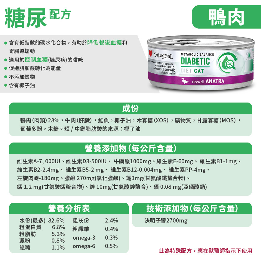 優質營養!Disugual 糖尿病貓罐頭,85g鴨肉處方糧,專為幼貓糖尿病配方設計。意大利製造,助貓咪維持健康血糖。正貨保證,限時優惠價,立即搶購! Disugual 意極鮮 處方糧 貓罐頭 糖尿病配方 鴨肉 85g (DSDTG081) | 意大利製造 - 限時優惠價