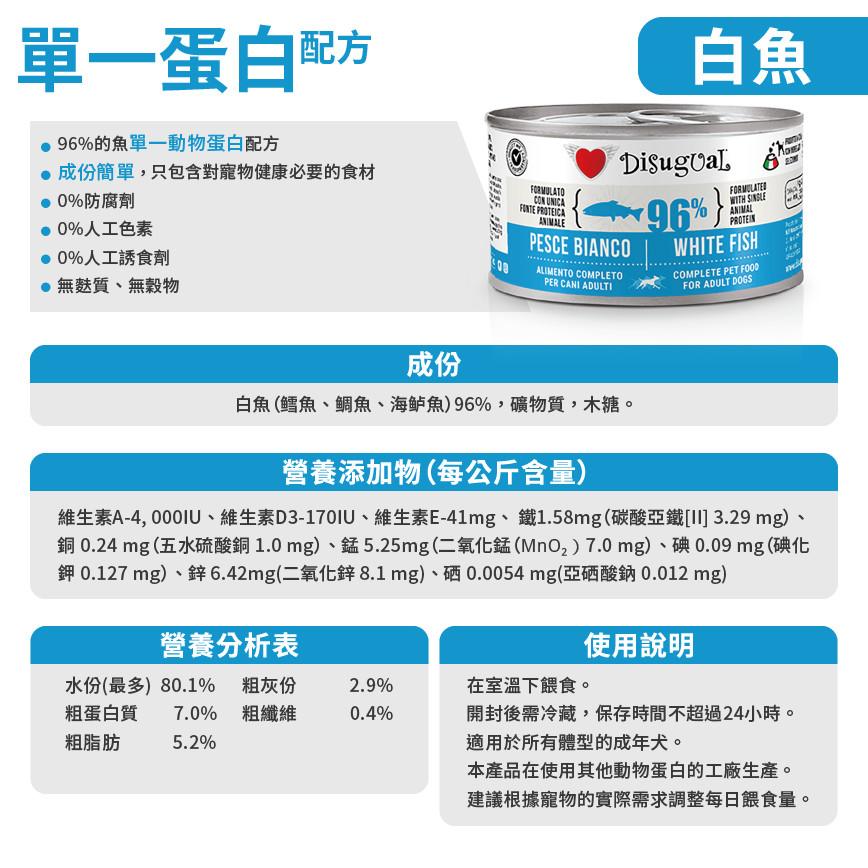 優質營養!Disugual 意極鮮狗罐頭,96%極品鮮肉白魚單一蛋白配方,150g意大利製造,專為您的愛犬設計,特別適合敏感腸胃。立即選購,享香港No.1人氣好評! Disugual 意極鮮 狗罐頭 狗主食罐 96%極品鮮肉 單一蛋白配方 白魚 150g (DSGV104) | 意大利製造