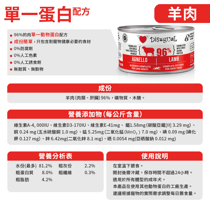 Disugual 意極鮮 狗罐頭 狗主食罐 96%極品鮮肉 單一蛋白配方 羊肉 150g (DSGV106) | 意大利製造