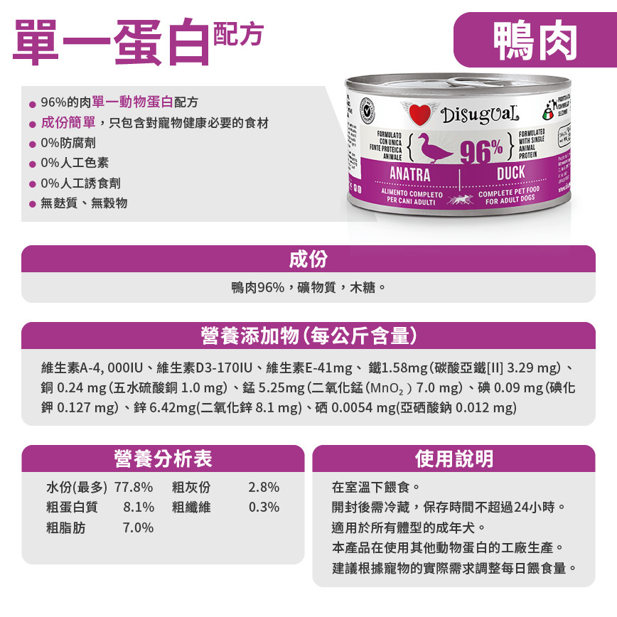 Disugual Duck 是成年狗的完整濕糧,由單一動物蛋白來源配製而成!