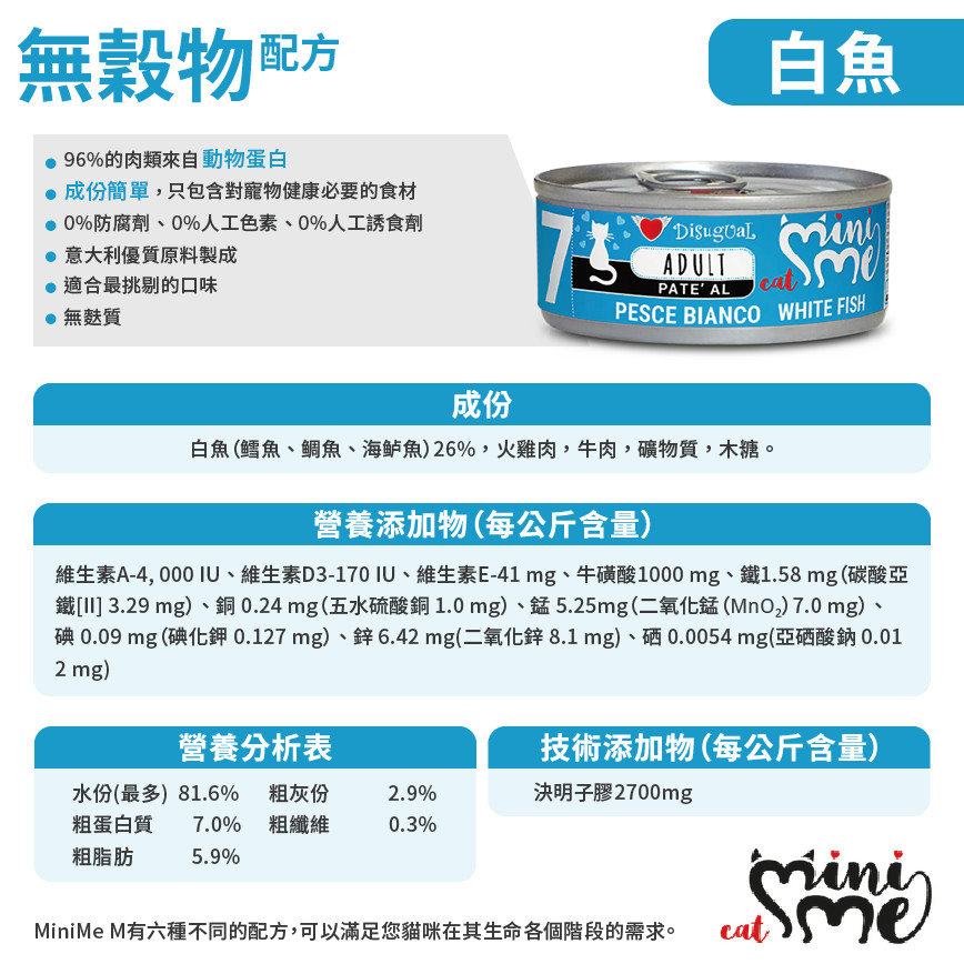 優質營養!Disugual 意極鮮 MINI ME7 無穀物白魚配方貓主食罐,85g 意大利製造,專為幼貓設計。提供全面均衡營養,助愛貓健康成長。立即選購,新會員三連送! Disugual 意極鮮 貓罐頭 貓主食罐 MINI ME7 無穀物白魚配方 85g (MIME003) | 意大利製造 - 限時試食價