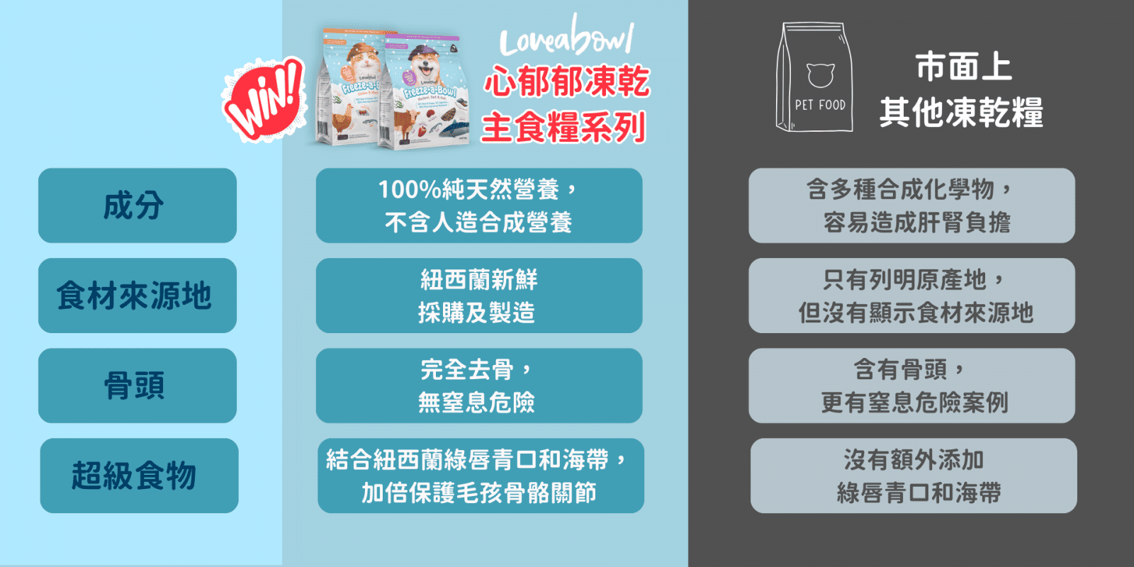 立即為您的愛寵選擇Loveabowl,體驗來自加拿大、天然純淨的頂級寵物食品。讓牠們每一餐都充滿愛與活力,享受健康幸福的每一天。Loveabowl 評價優良,是您不容錯過的優質選擇。Loveabowl 比較市面上其他品牌,我們的品質與用心一目瞭然。