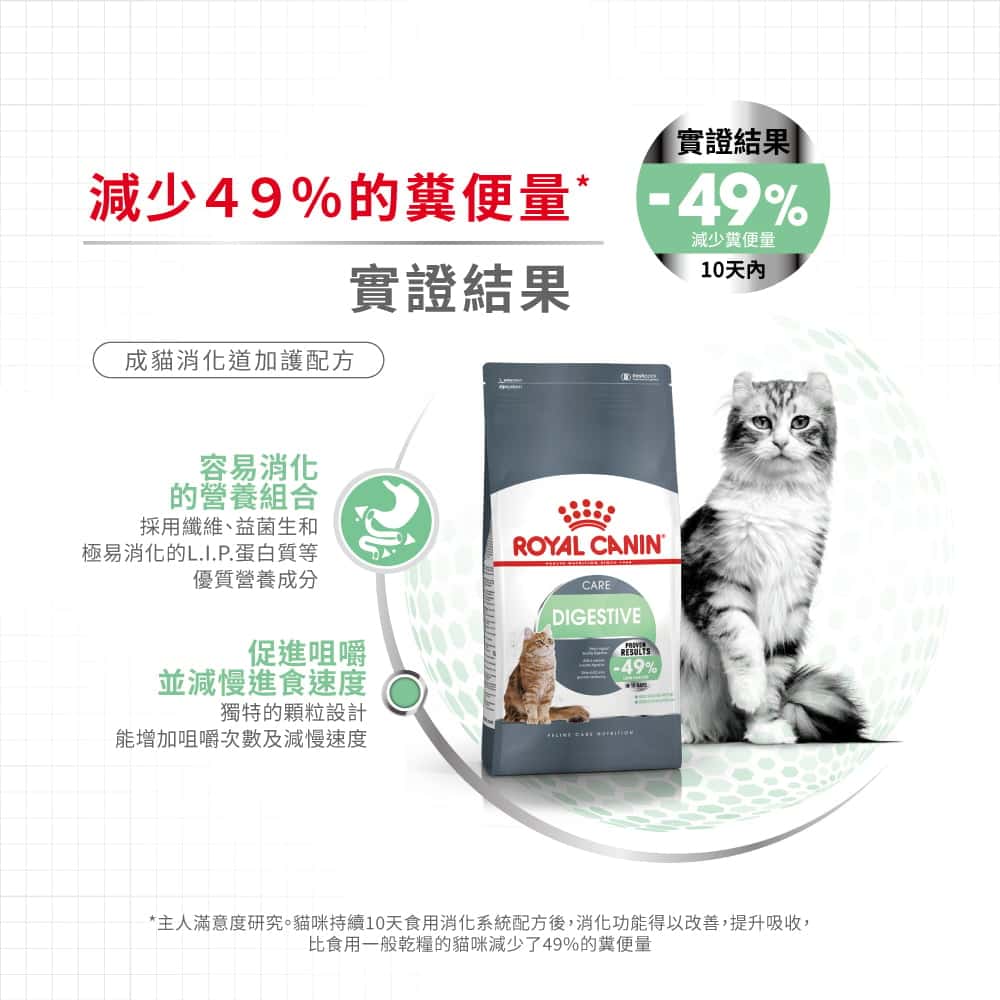 配方10天後的效果:由於改善了腸胃及營養吸收,所生成的糞便減少了49%*。   * Royal Canin 2014內部研究 - 與餵飼保養食物的成貓作比較。