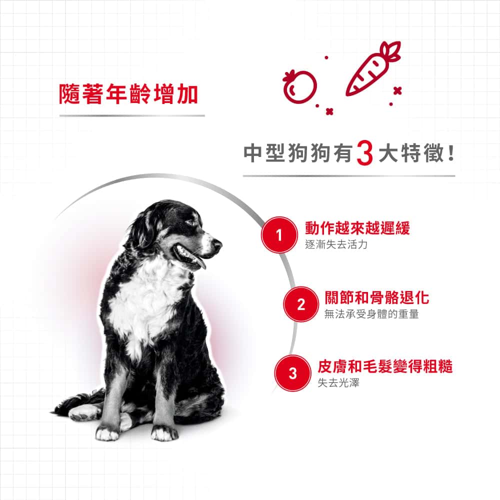 幫助中型犬在進入衰老階段仍可維持骨骼及關節健康。