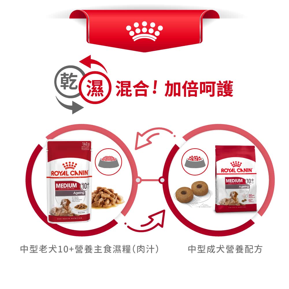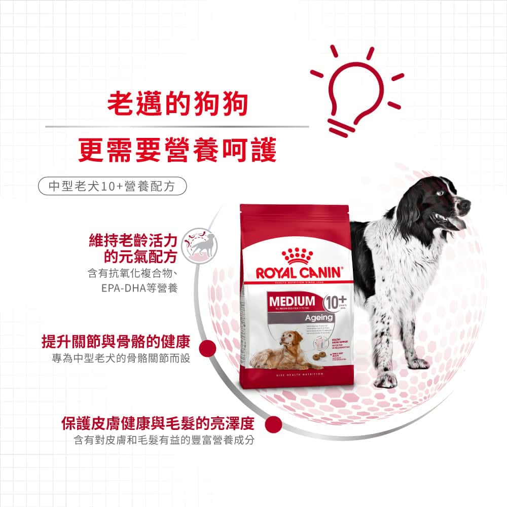 優質營養!Royal Canin 法國皇家狗糧專為中型老犬10+設計,提供專屬營養配方,支持老犬健康活力。特別添加抗氧化劑,呵護中型老犬關節與消化系統。PetChill 香港最大寵物用品網店,立即選購享至抵價格保證! Royal Canin 狗糧 法國皇家狗糧 健康營養系列 中型老犬10+營養配方 中型老犬糧 10+ 3kg