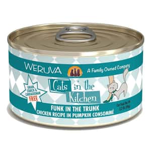 Weruva Cats in the Kitchen Funk in the Trunk 是一款由家族企業 Weruva 精心調配的高品質貓用濕糧。這款產品以去骨去皮雞胸肉為主要蛋白質來源,搭配南瓜清湯,主打無穀物、無澱粉、無卡拉膠的三無配方,並含有高達87%的水分,能有效幫助貓咪補充水分、維持泌尿健康,同時支持消化與排毛功能,是挑嘴貓或腸胃敏感貓咪的優質主食選擇。