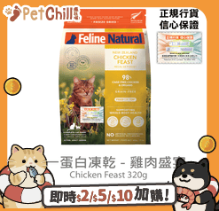 免費罐頭小食即送!Feline Natural 貓糧 雞肉盛宴 320g 專為成貓設計,單一蛋白配方,選用優質雞肉,助貓咪維持健康消化系統。Feline Natural 雞肉 貓糧 香港至抵價,立即選購,讓愛貓享受天然營養! Feline Natural 貓糧 單一蛋白系列 雞肉盛宴 320g (F9-C320)