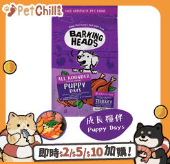 優質營養!Barking Heads 無穀物 火雞配方 幼犬狗糧 2kg,全天然防敏,專為幼犬成長設計。提供完整均衡營養,幫助幼犬健康發育,減少過敏。立即選購,PetChill 最多最齊貓狗玩具贈品 寵物店! Barking Heads 狗糧 無穀物 全天然防敏幼犬成長 火雞配方 2kg (BHP2) (紫色) (新舊包裝隨機)