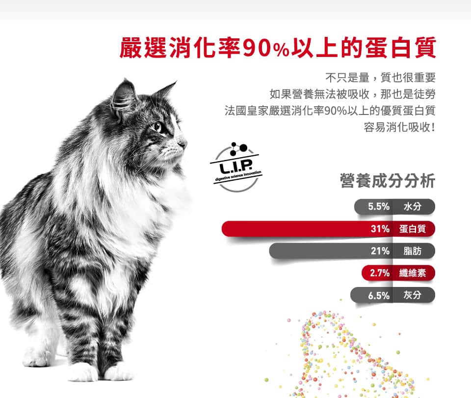 食糧的氣味、質地口感、以及可增加飽足感的高密度,都是Royal Canin法國皇家在設計產品時會考慮的因素。品牌致力於開發高消化性的食糧配方,透過添加特定的營養成分,幫助寵物有效吸收食物中的養分,減少消化不良的問題。同時,良好的適口性確保了寵物對食物的接受度,即使是挑食的寵物也能樂於進食。