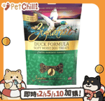 主要特點:選用鴨肉作為單一動物蛋白來源,鴨肉是一種較不常見的蛋白質,可作為食物敏感犬隻的替換選項。配方中加入鷹嘴豆、豌豆等植物性成分,提供膳食纖維與其他營養素。無穀物配方設計,避免穀物過敏問題。